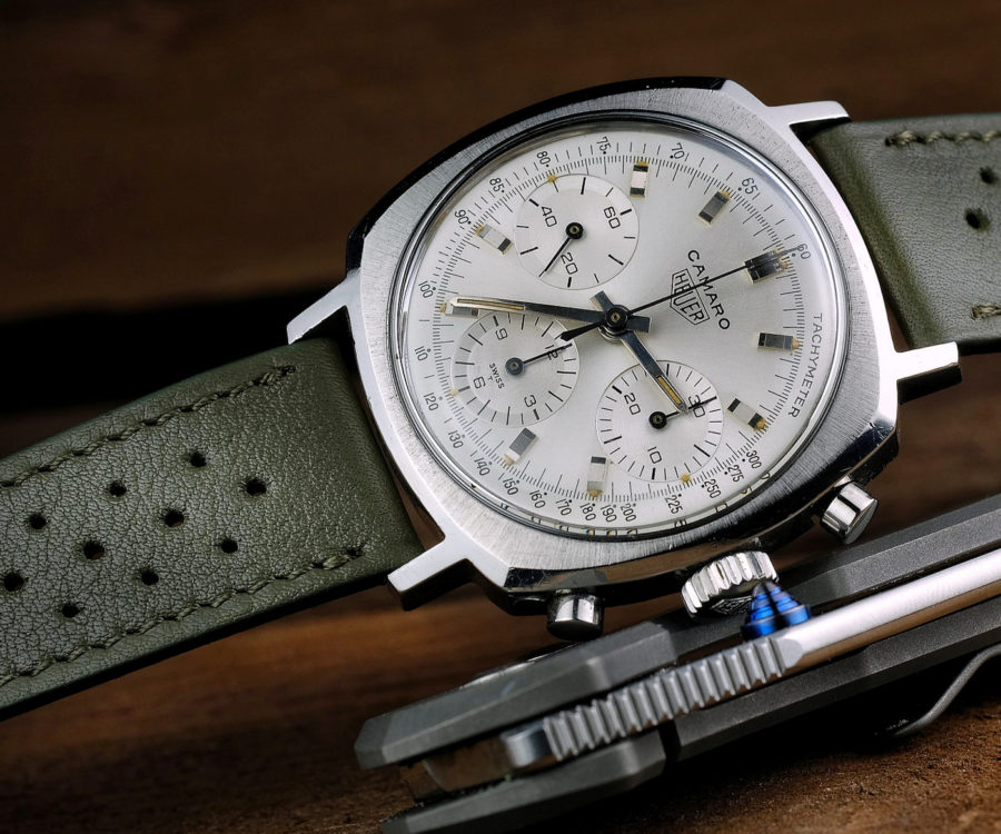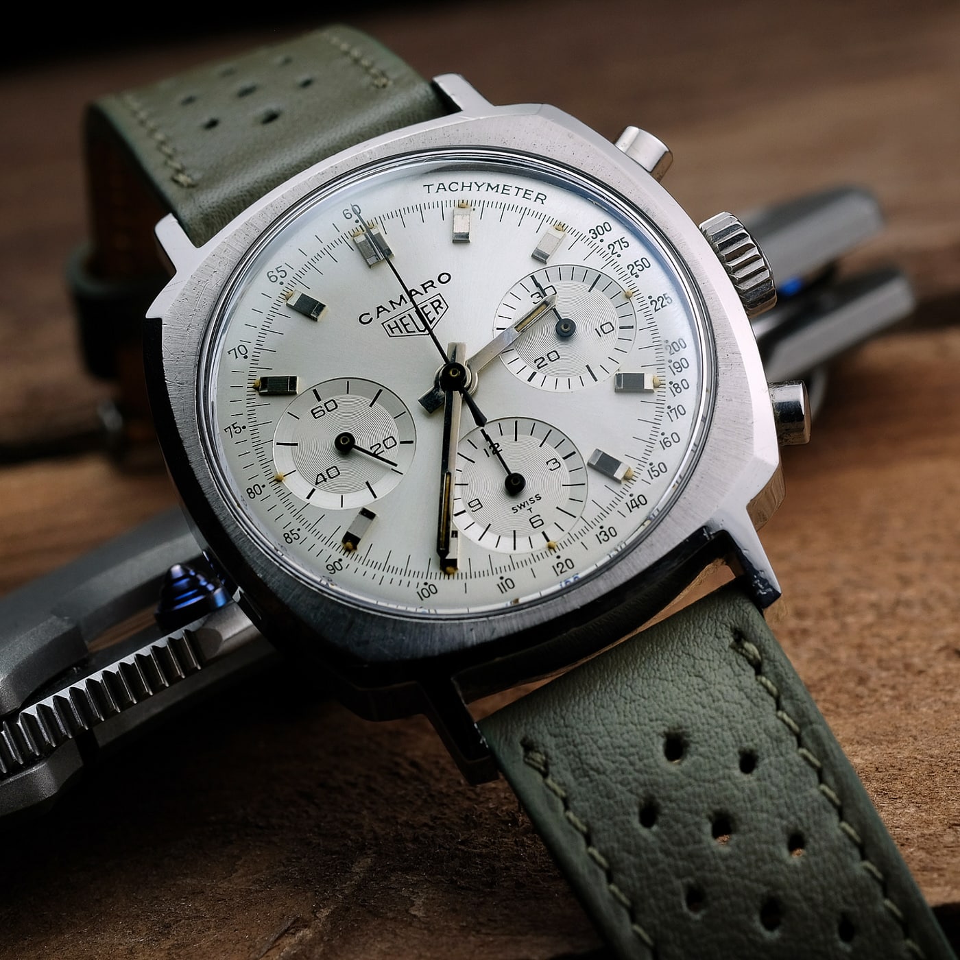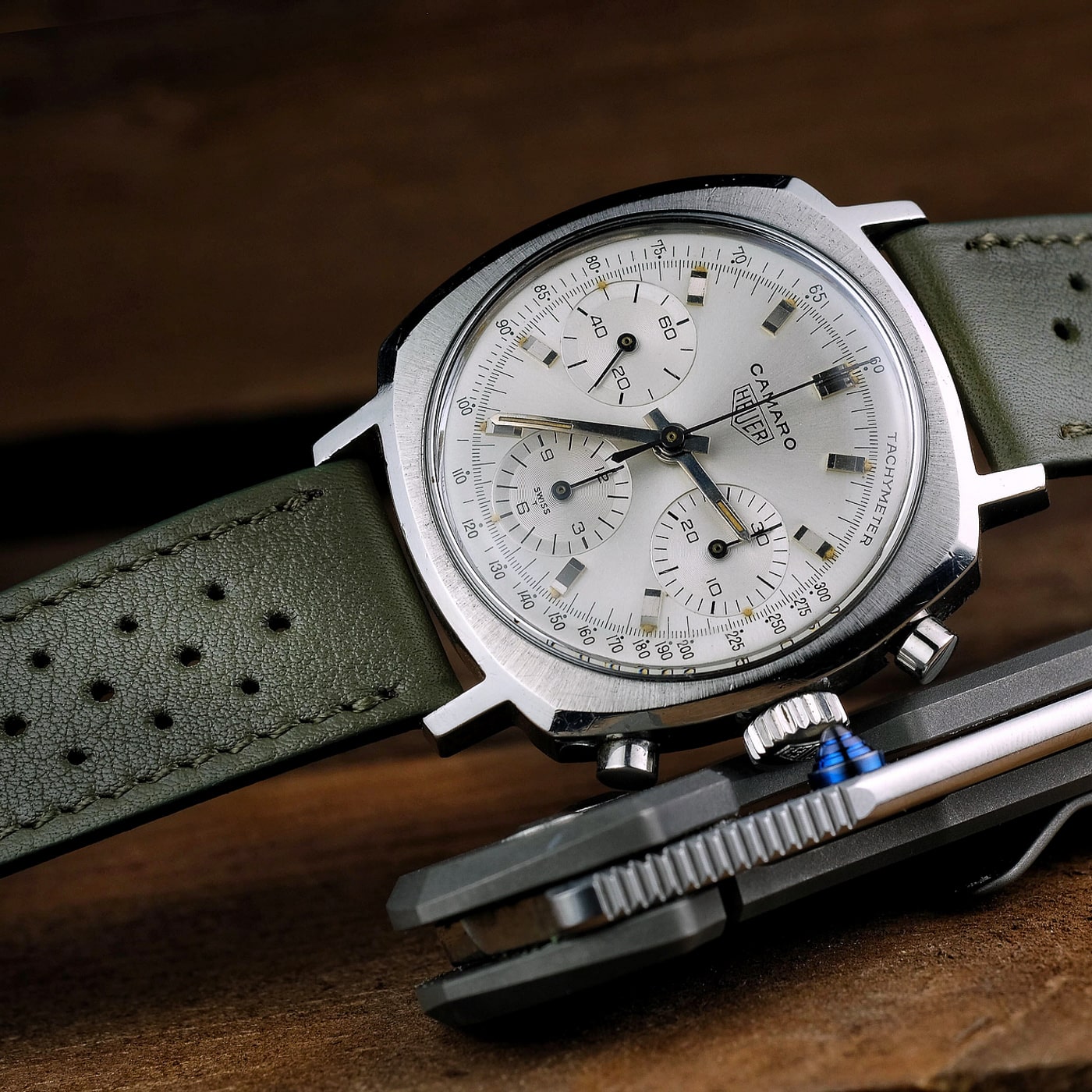 Black dial watches will find there a more military style while whiter dials watches will be modernized by this very subtle Khaki Green and its unique Racing look.